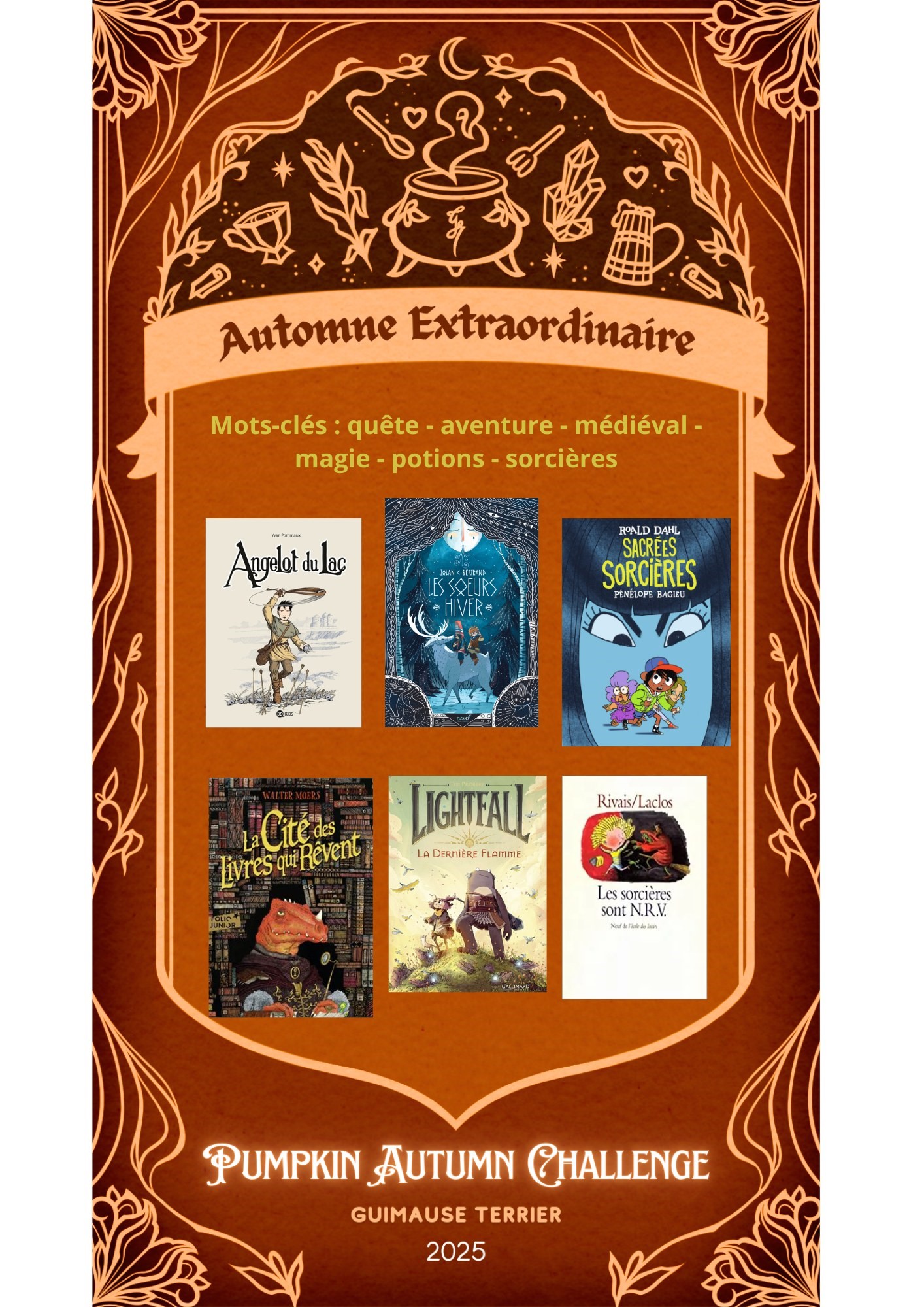 Chère lectrice, cher lecteur, Le Pumpkin Autumn Challenge (ou "défi d'automne de la citrouille" en bon français) est de retour à la médiathèque. Mais contrairement à l'année dernière nous nous adressons aujourd'hui aux jeunes lecteurs. Le principe ? L'influenceuse Guimause Terrier, créatrice du défi, nous propose chaque année des thèmes en lien avec l'automne qu'elle regroupe au sein de trois "tableaux". • Le tableau de l'automne frissonnant regroupe des livres effrayants ou...